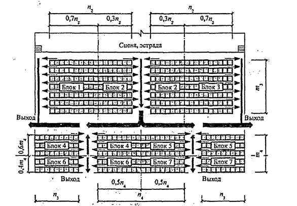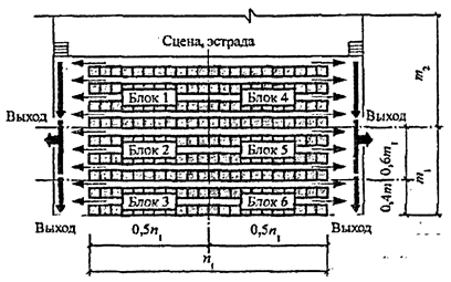зрителей по направлениям движения с зрительских мест n в рядах m к выходам из